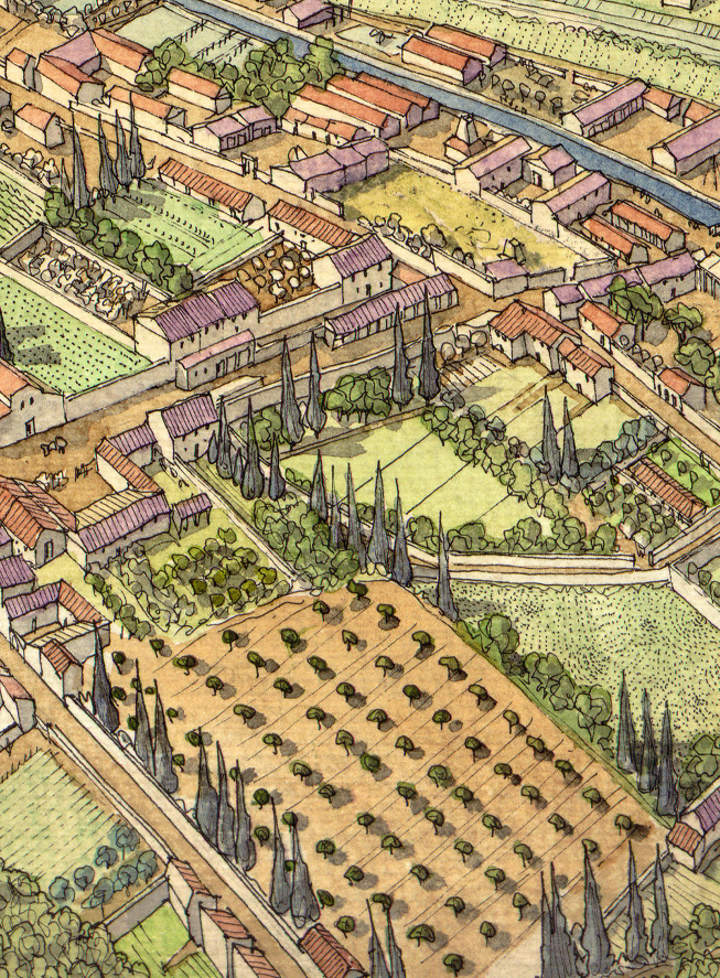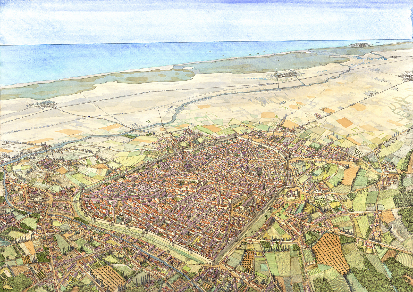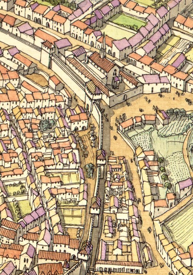 La ville se développe, non loin de la mer Méditerranée, à l’intérieur d’une enceinte fortifiée, ponctuée de tours et de portes, et complétée d’un fossé.