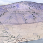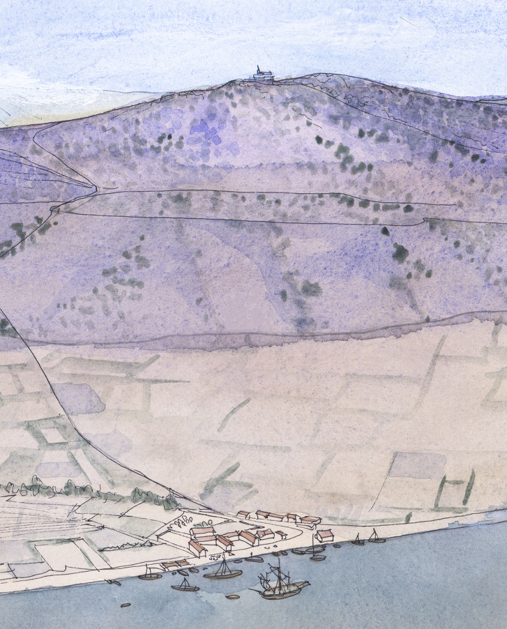 L’amphithéâtre antique en ruine se dresse sur la gauche du dessin.