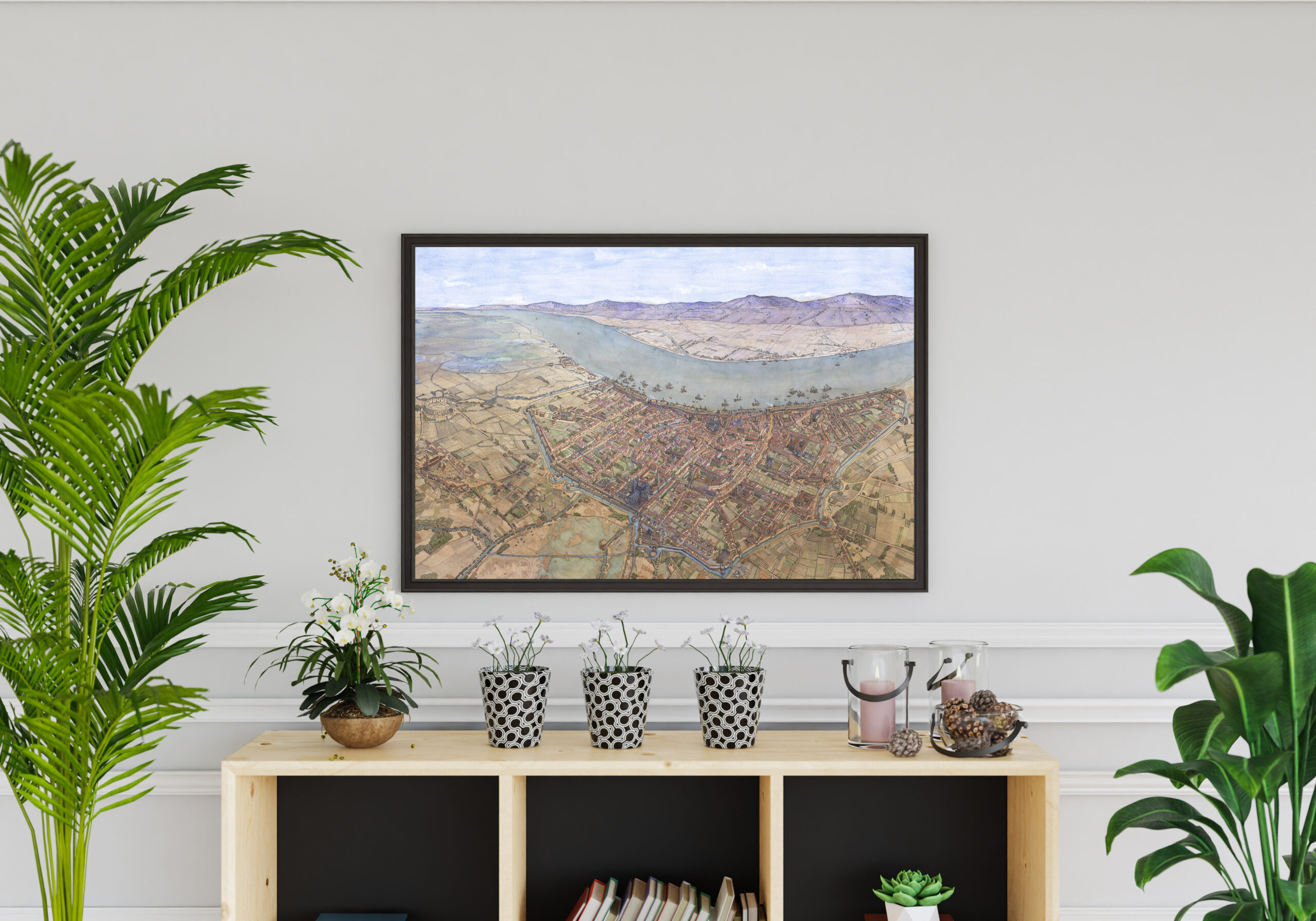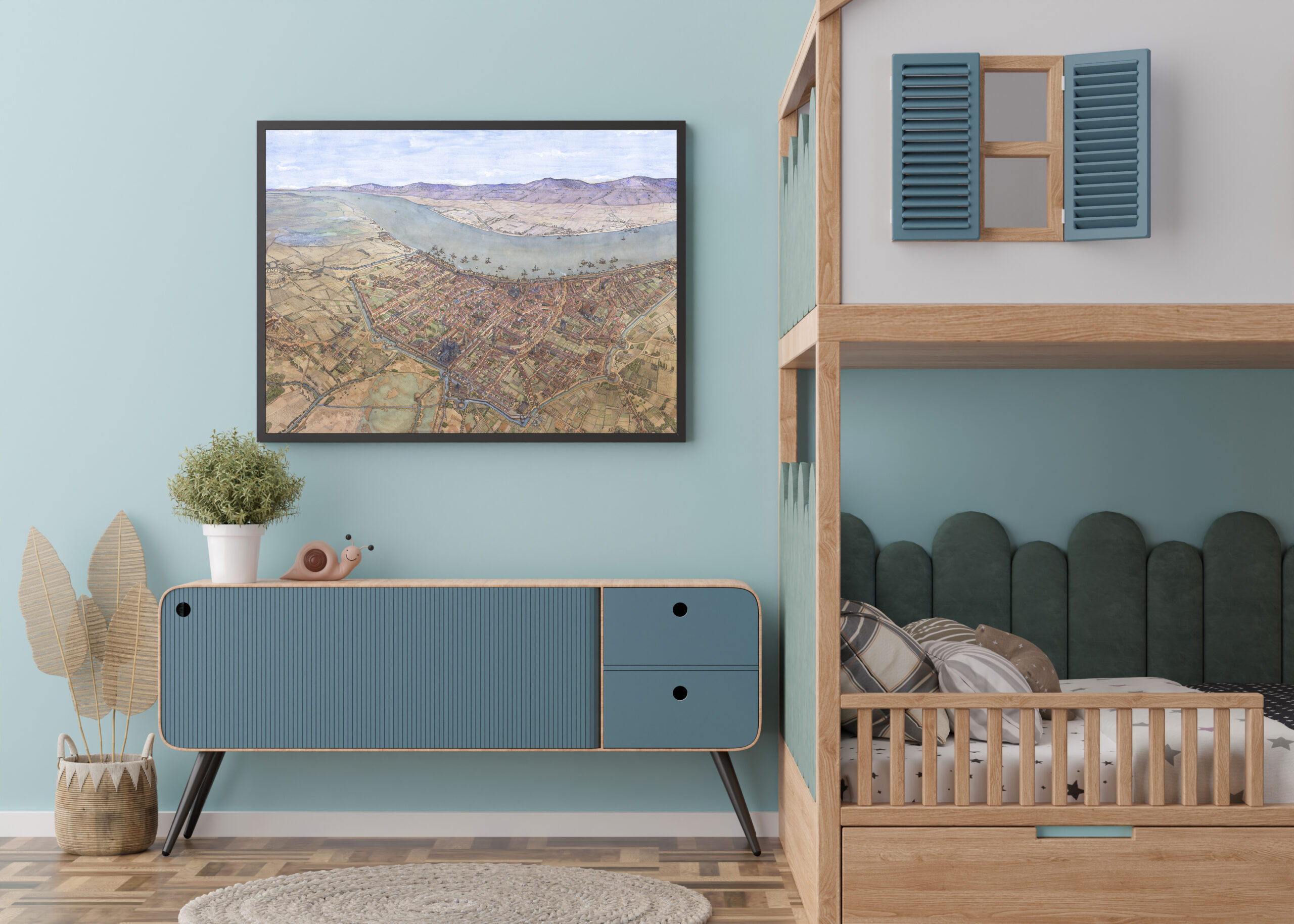 Imprimé sur commande, le dessin est au format paysage et proposé dans les dimensions 98 x 68 cm.