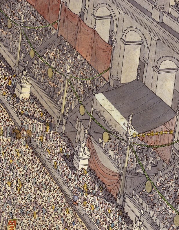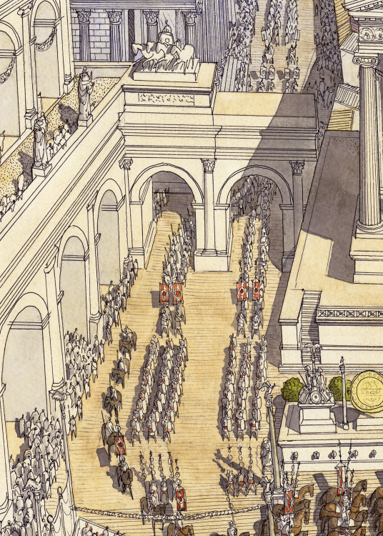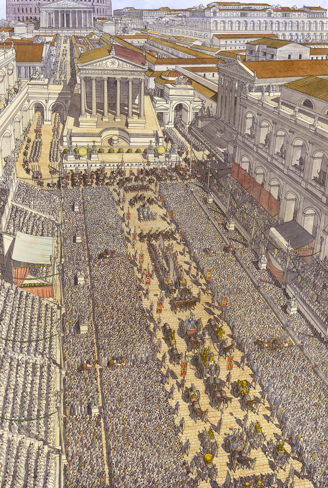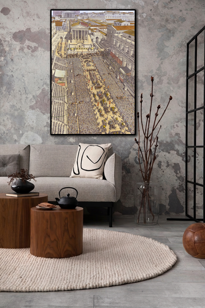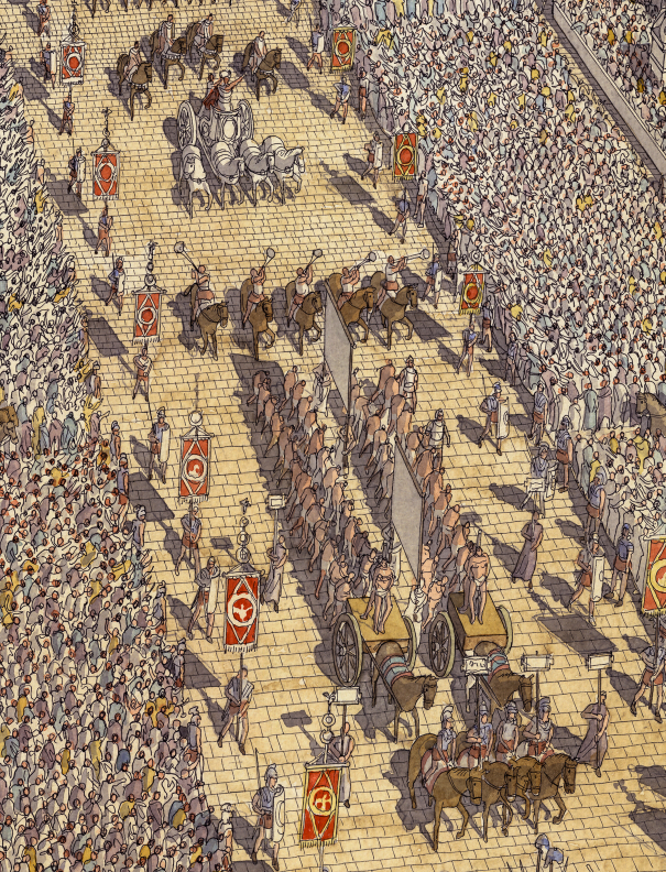 La boutique vous propose cette représentation en grand format de “Roma (Rome), la procession du Triomphe traversant le Forum Romain” par Jean-Claude Golvin.