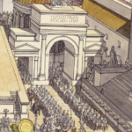 La scène représente la procession du Triomphe qui traverse le Forum Romain, la plus prestigieuse cérémonie de Rome selon Scipion l’Africain.