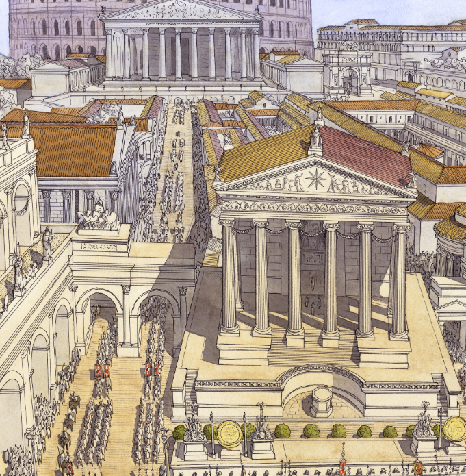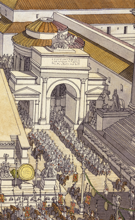 Le général vainqueur (imperator) défile à la tête de ses troupes et monte jusqu’au Capitole remercier Jupiter de la protection apportée durant une campagne militaire suivant un rituel précis.