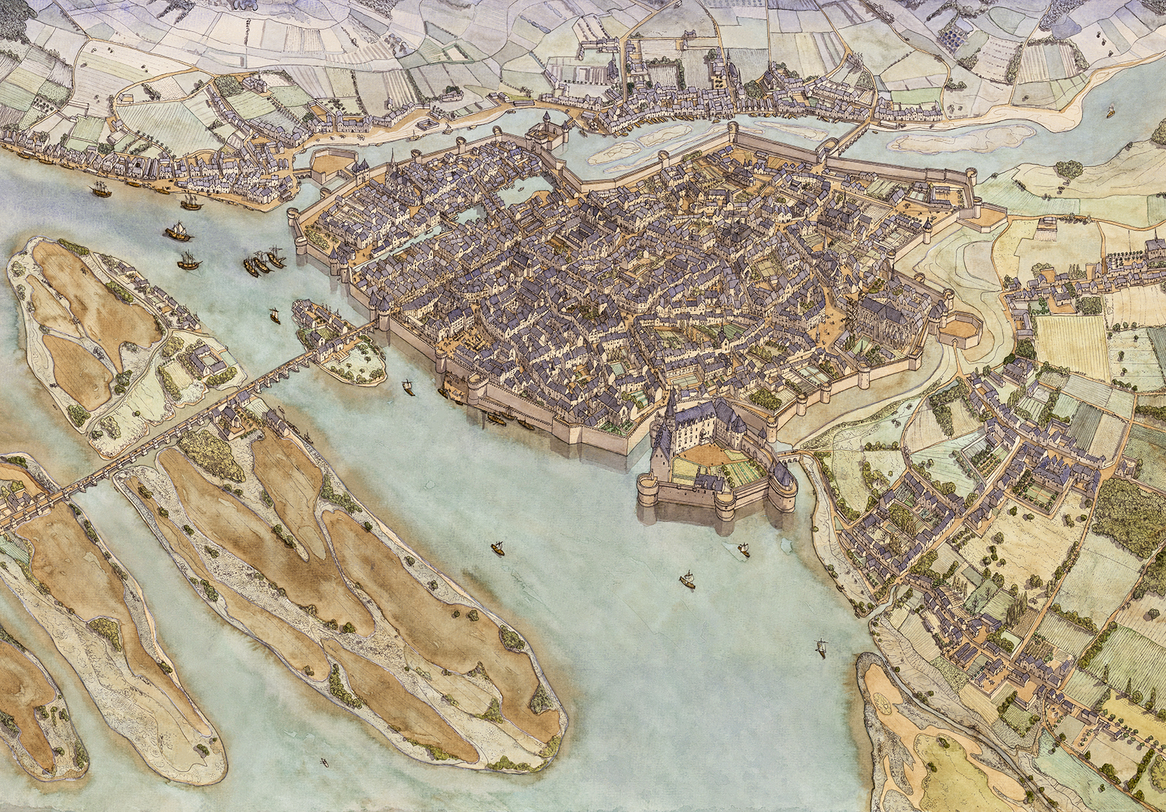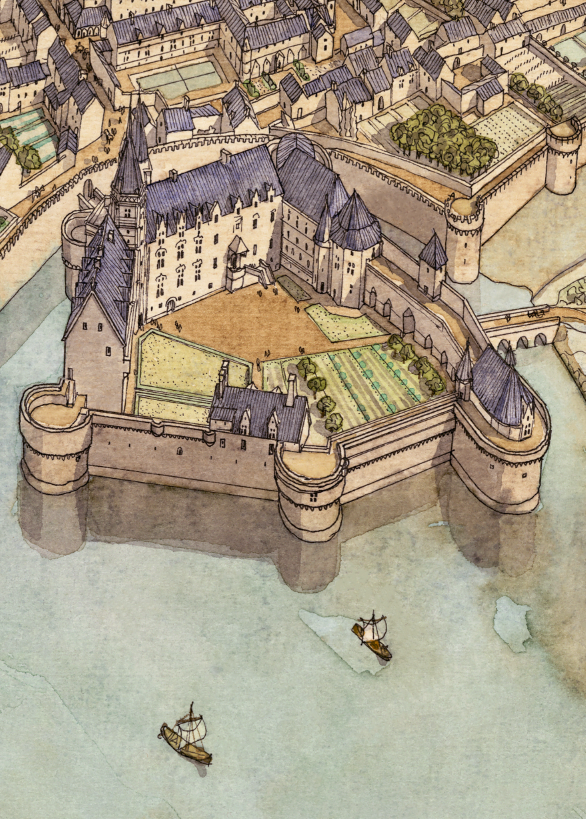 Le château des ducs de Bretagne est construit sur une petite île, dans la partie basse du dessin.