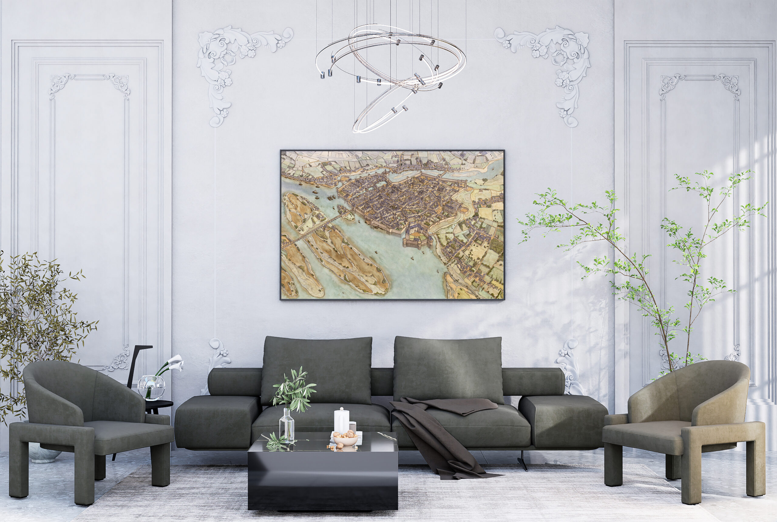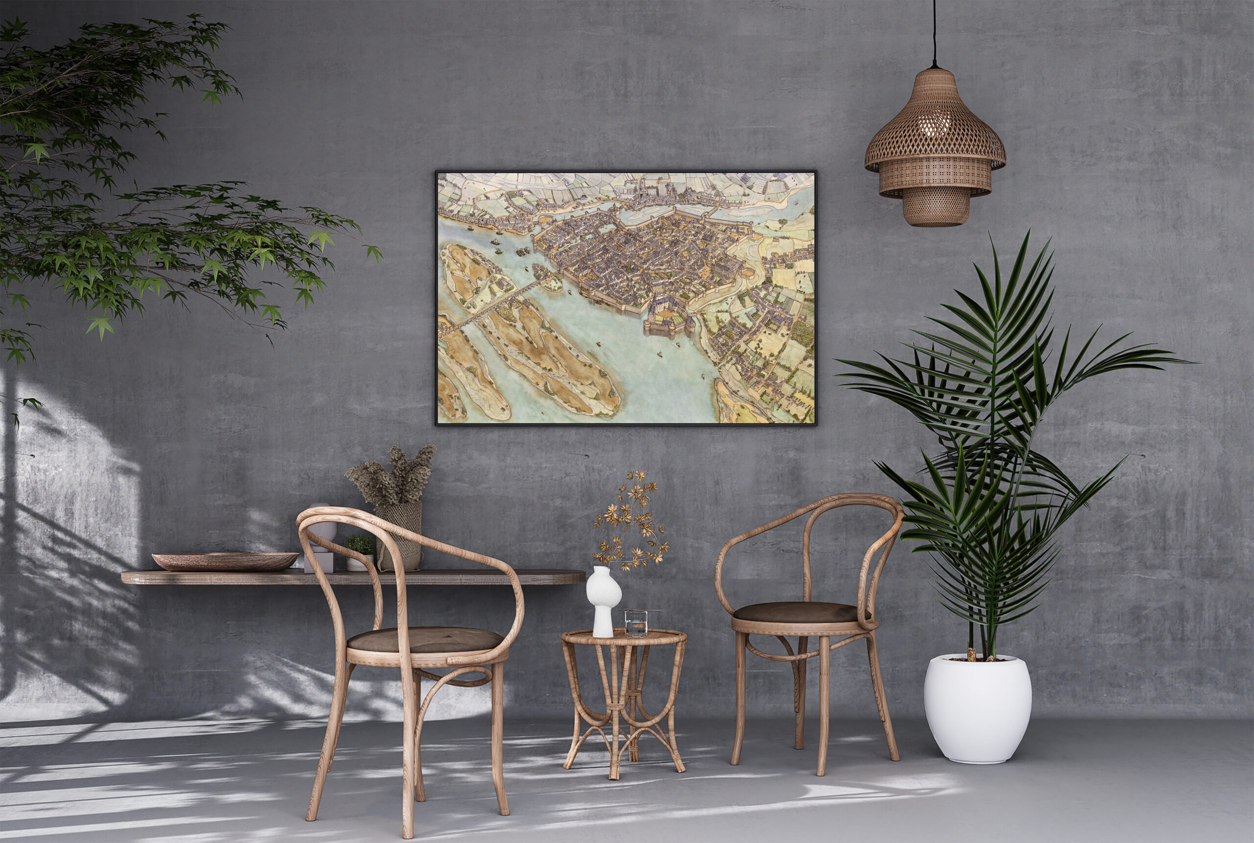 La ville est implantée au confluent de la Loire, visible dans la partie basse du dessin, et de l’Erdre, visible dans la partie haute du dessin. Plusieurs ponts en pierre traversent les cours d’eau.