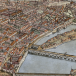 La ville s’organise de part et d’autre de la Garonne, représentée au centre du dessin.
