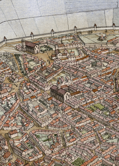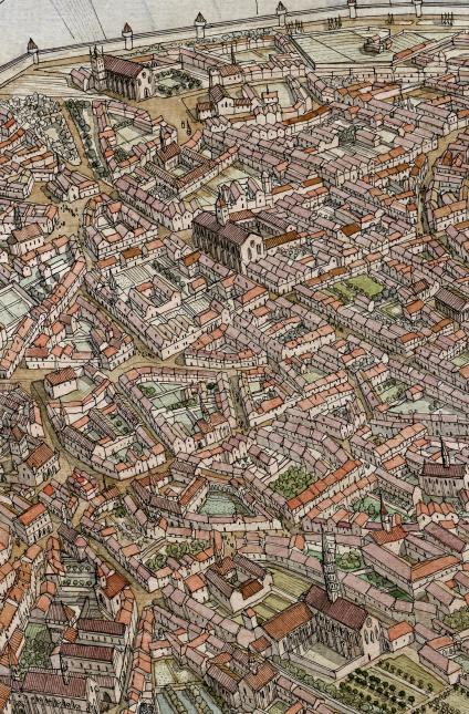 Des édifices religieux se dressent au milieu des habitations. Sur la gauche du dessin, on distingue la basilique Saint-Sernin, avec son haut clocher. Le château et les moulins du Bazacle prennent place sur les rives, dans la partie inférieure du dessin. La ville est entourée de champs agricoles.