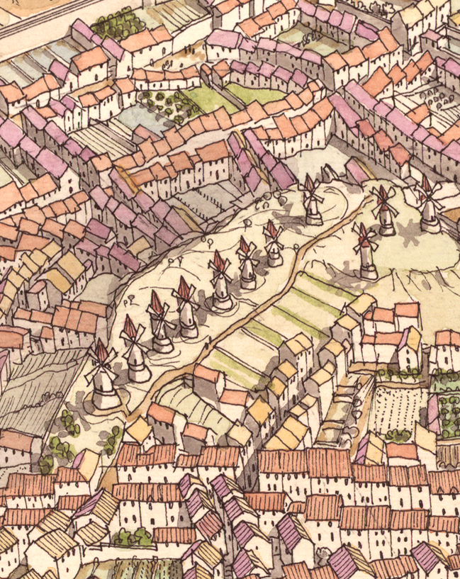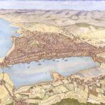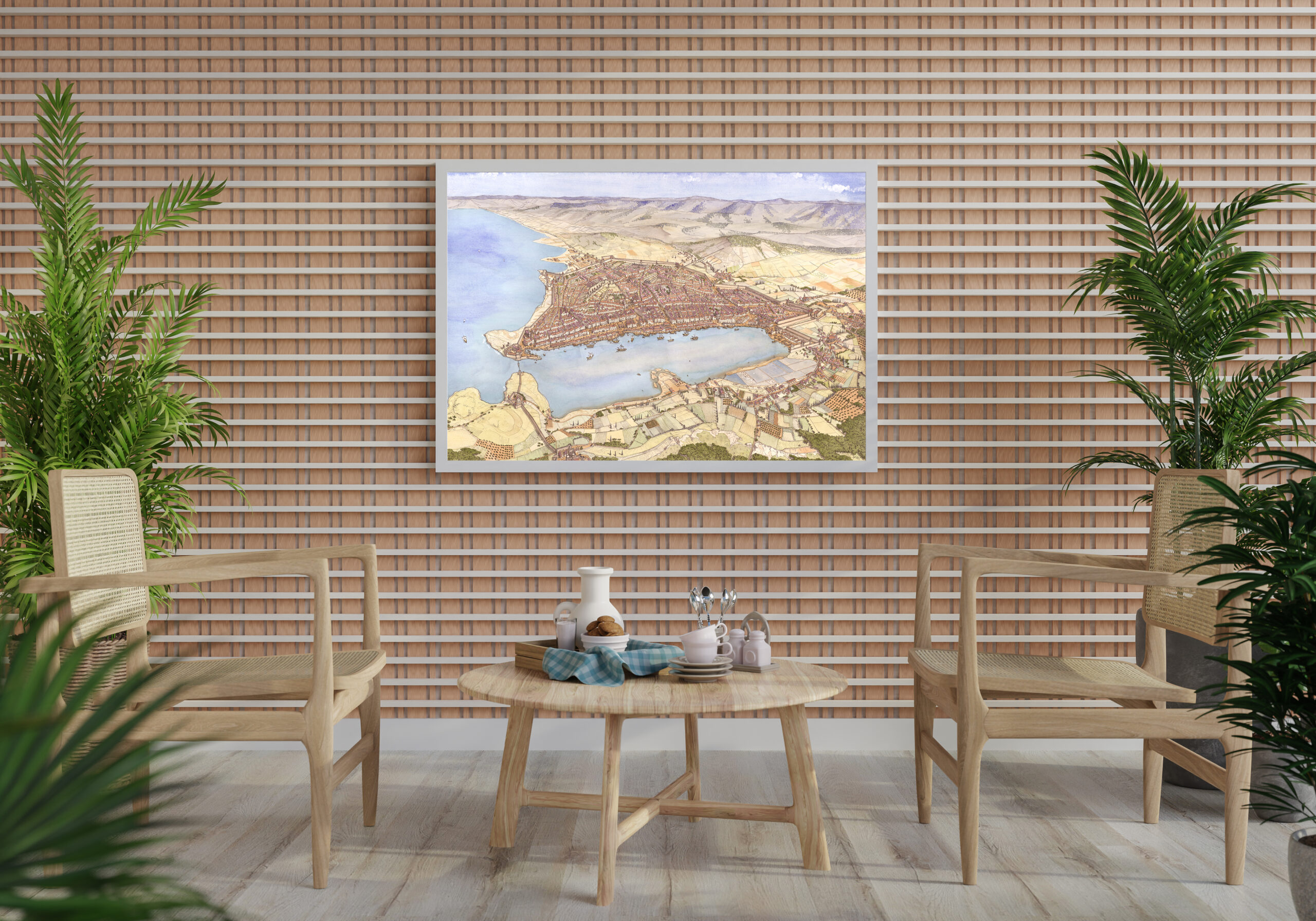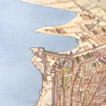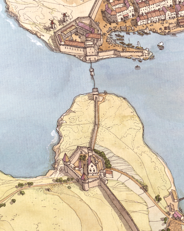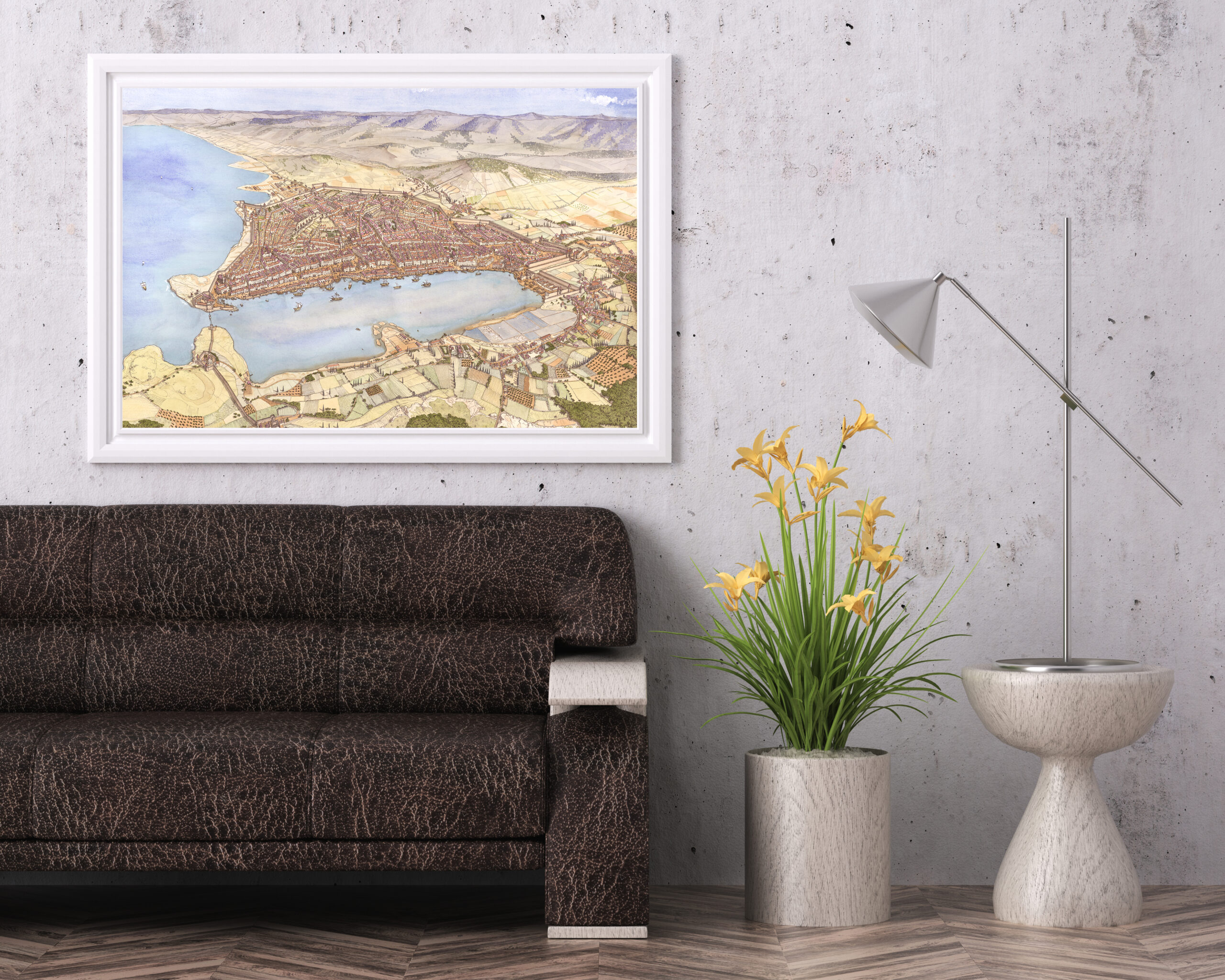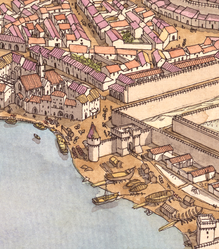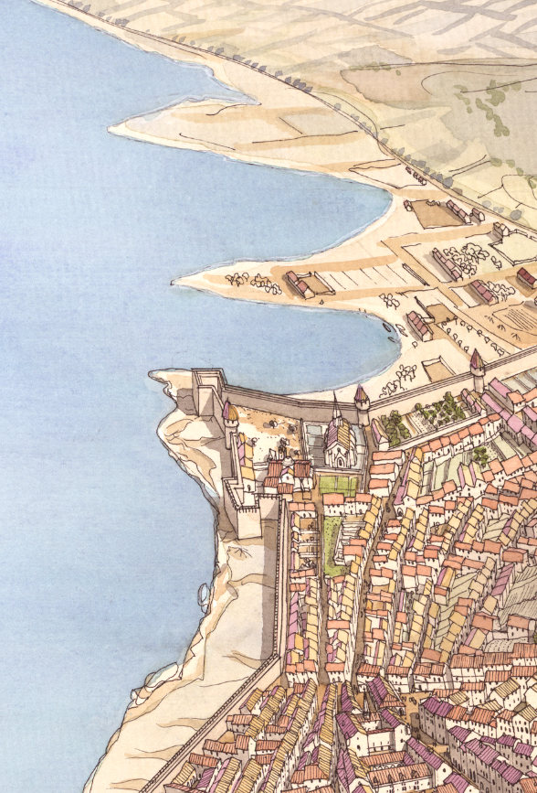 La ville se développe le long d’une baie, sur la côte de la mer Méditerranée, visible sur la gauche du dessin. Elle est ceinte d’une muraille fortifiée, percée de portes et ponctuée de tours.