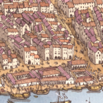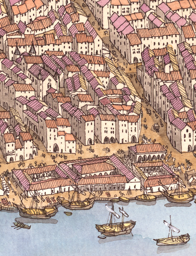On aperçoit le port et les activités commerciales de la ville au centre du dessin. Des bateaux circulent ou sont amarrés sur le quai. Plusieurs édifices religieux se dressent au milieu des habitations.