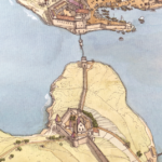 Le chenal d ‘accès est fermé par le fort Saint-Jean, au nord, et par le fort Saint-Nicolas, au sud. Sur cette rive, on distingue la basilique Saint-Victor et des champs agricoles. Les collines marseillaises se dessinent au loin.