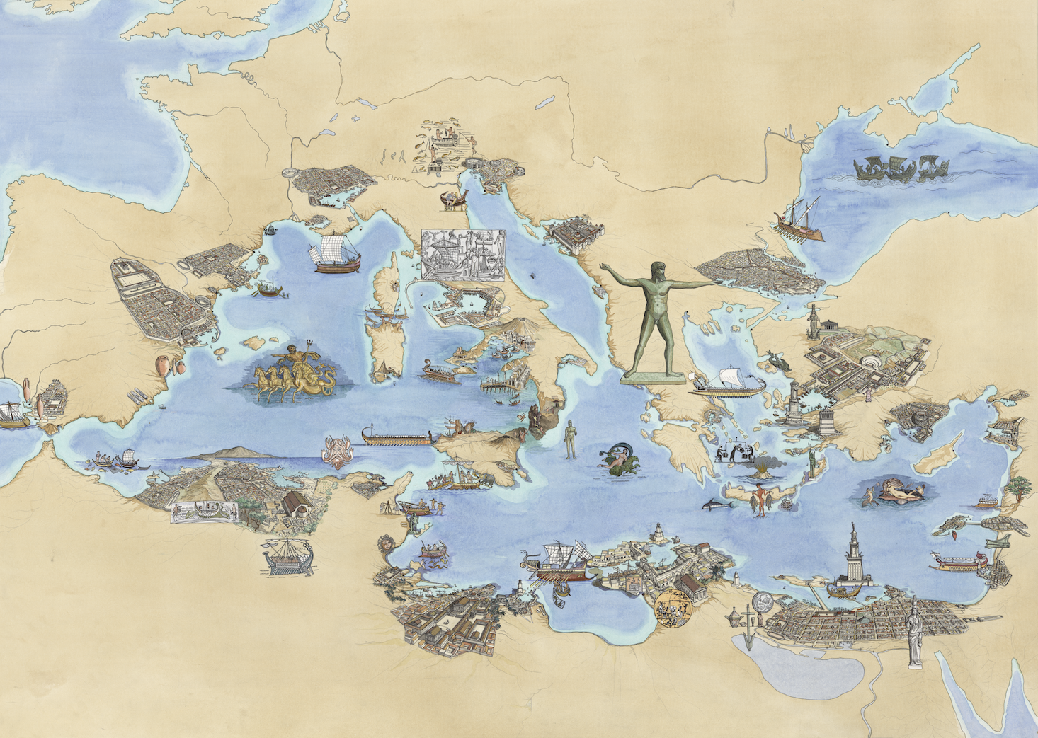 Vue aérienne du sanctuaire d’Olympie. Le dessin est au format paysage et ne comporte pas de cadre. Des inscriptions figurent au verso.