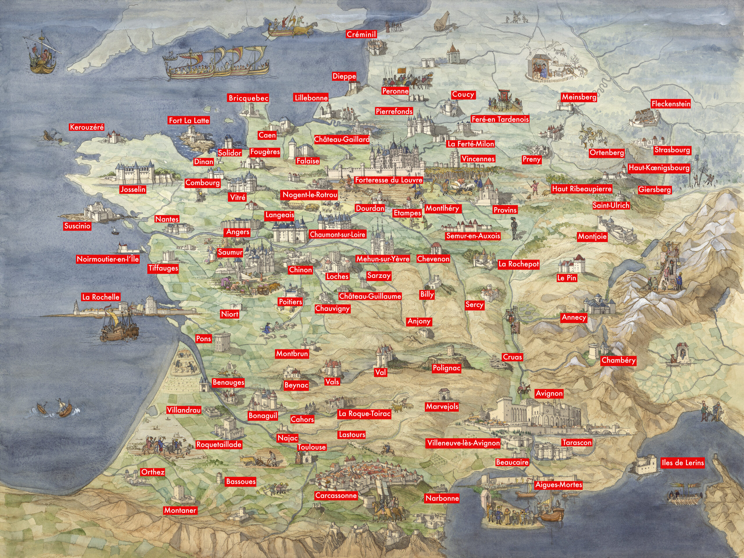 La boutique vous propose une représentation en grand format de la France des châteaux à l’époque médiévale par Jean-Claude Golvin.