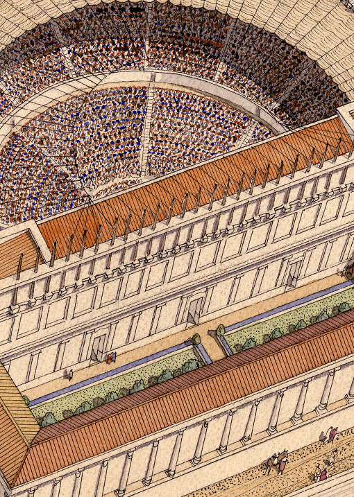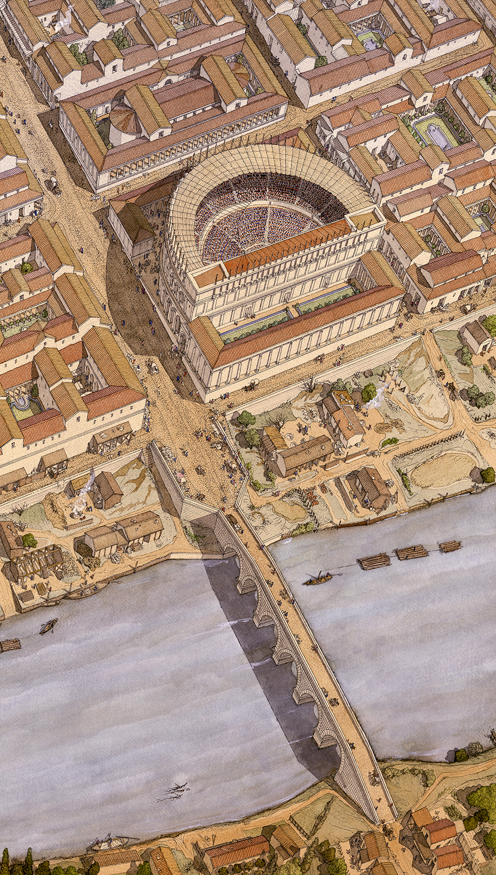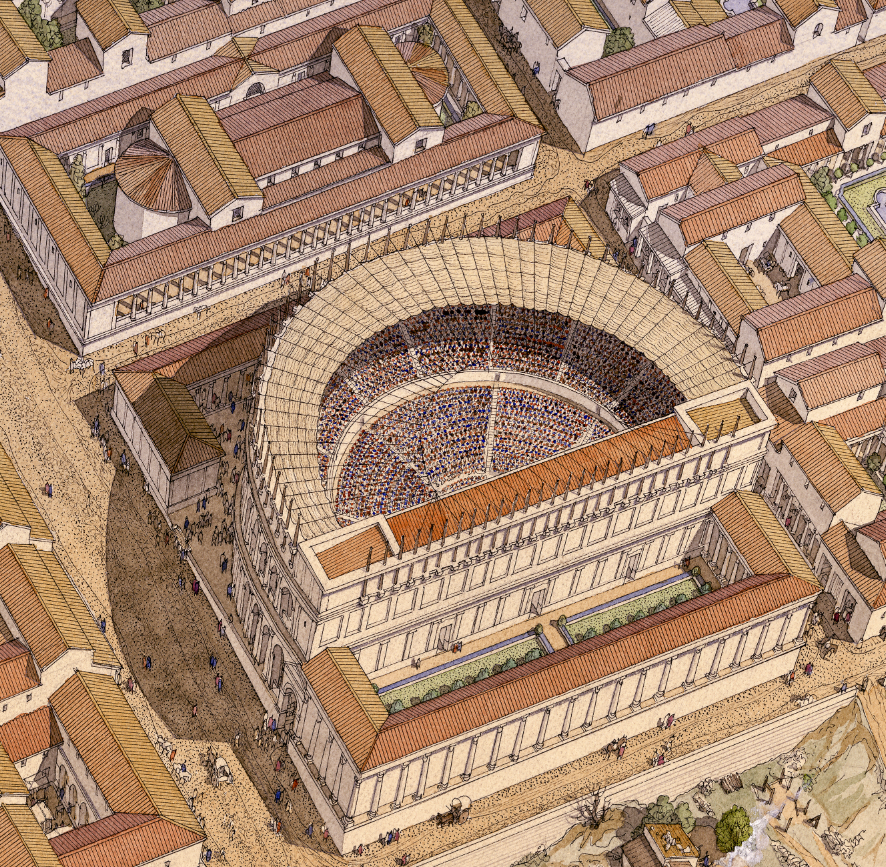 Au centre du dessin, est représenté l’amphithéâtre pendant un spectacle : les gradins sont remplis de spectateurs. L’édifice se situe en bordure de la ville, près de la Vienne et du pont qui permet de la traverser.