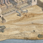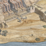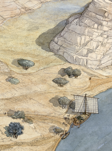 Dans la partie inférieure du dessin, on distingue le Nil et sa vallée. Un bateau est amarré à la rive.