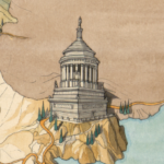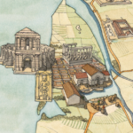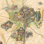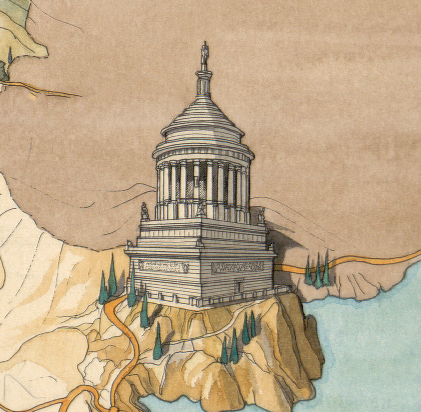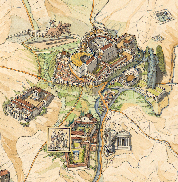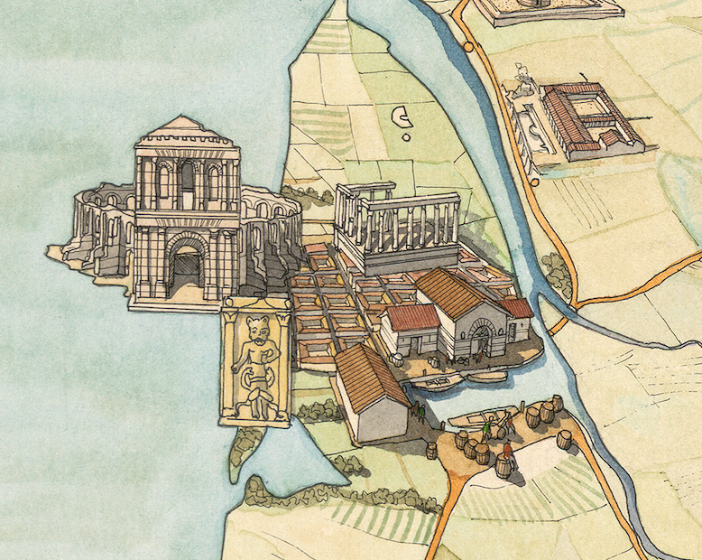Sur la carte sont figurés différents édifices parmi lesquels des théâtres, des amphithéâtres, des odéons, des villas… Dans la mer, près des côtes, on distingue quelques bateaux.