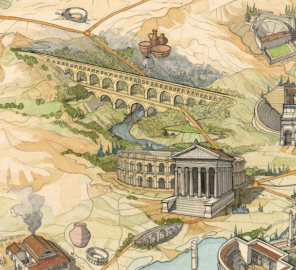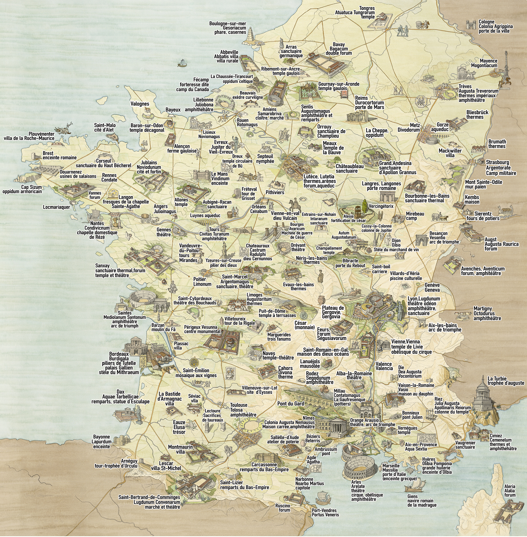 C’est un support idéal pour faire découvrir par l’image, aux jeunes comme aux moins jeunes, les plus belles constructions de la Gaule à l’époque romaine. Le dessin comprend au total 156 références (un record pour une carte iconique de Jean-Claude) et pour permettre l’identification de chaque élément représenté, une carte au format A3 avec les légendes est jointe à l’envoi.