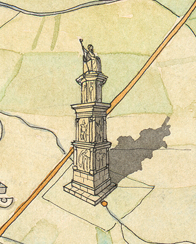Le dessin est au format carré (L68 x H69 cm) et représente les villes romaines et leurs monuments majeurs, ainsi que les axes de circulation.
