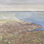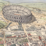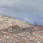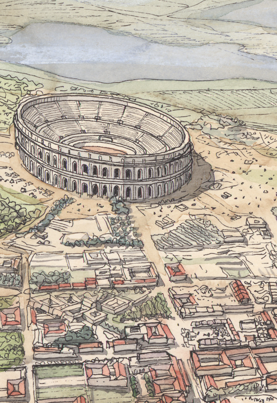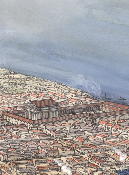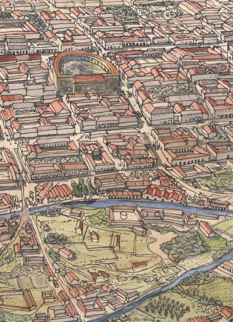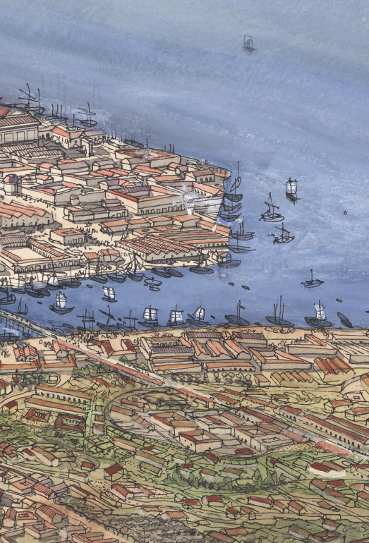 Le port de la ville se situe à son embouchure. Le forum se trouve à l’intersection du cardo (axe nord-sud) et du decumanus (axe est-ouest), non loin de la rive. Il est constitué d’une cour rectangulaire à portique, d’un temple et d’une basilique. Sur la gauche du dessin, il est possible de distinguer le théâtre et l’amphithéâtre. Au loin se dessine une zone marécageuse.